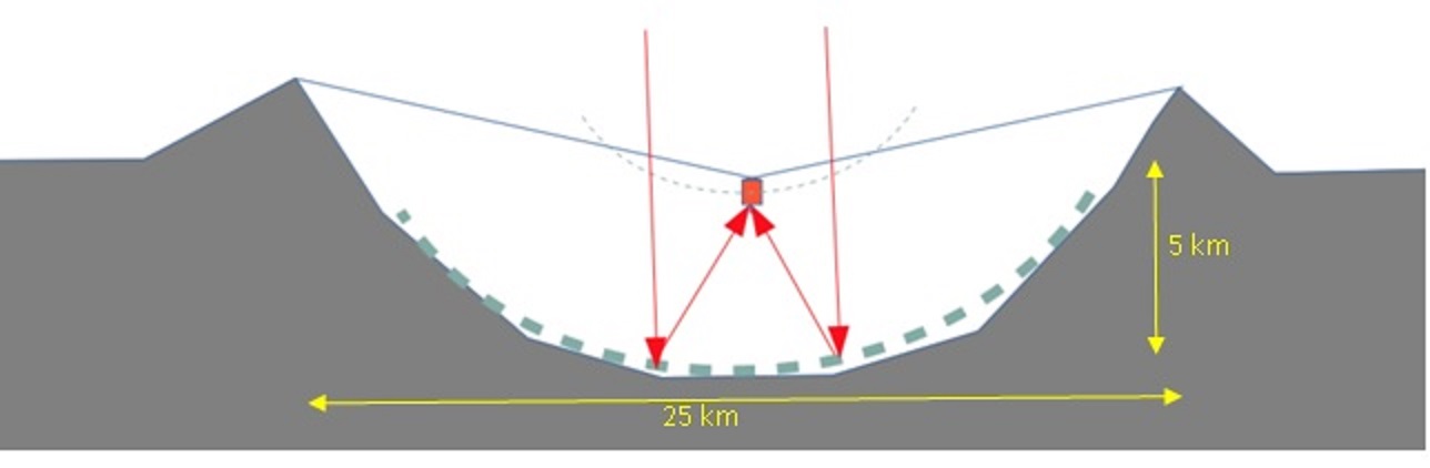 Figure 1: Sketch, at approximate scale, of a Crater-Nested Lunar Hypertelescope, with its focal receiver suspended from cables and movable along the focal surface (fine dotted arc). The locus of the mirror array (fat dotted arc) is either paraboloïdal, actively deformable by applying small tip-tilt-piston corrections on its segments, or fixed and spherical if a corrector of spherical aberration is added in the focal optics. No delay lines are needed, but the meta-mirror size is limited to about 20 km by the maximal 6km depth of impact craters, for an effective meta-aperture of 5 to 10km. The mirror elements are either carried by separate fixed tripods or by a hammock-like cable netting .